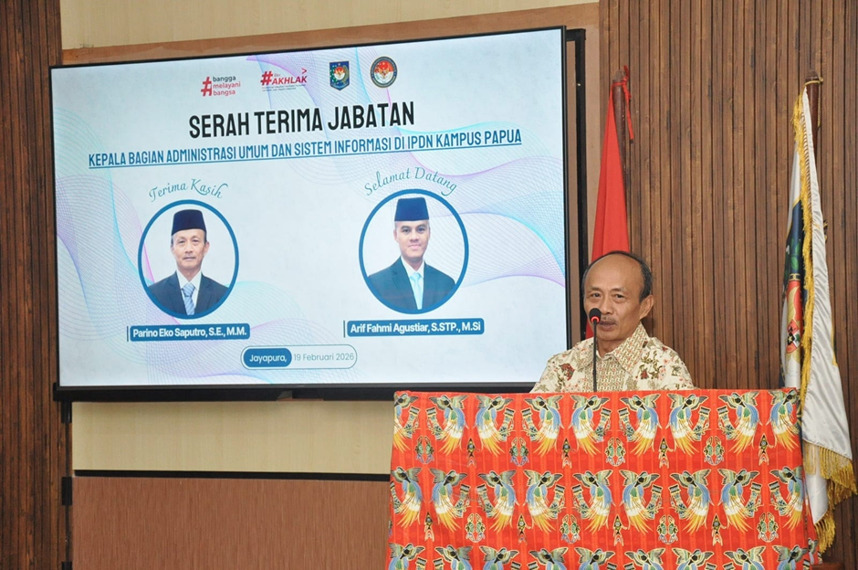 Jayapura, 19 Februari 2026. Institut Pemerintahan Dalam Negeri (IPDN) Kampus Papua melaksanakan serah terima jabatan Kepala Bagian Administrasi Umum dan Sistem Informasi diruang rapat Gedung Sekretariat Lantai 2. Serah terima jabatan dilakukan oleh Bapak Parino Eko Saputro S.E., M.M. kepada Bapak Arif Fahmi Agustiar, S.STP., M.Si.